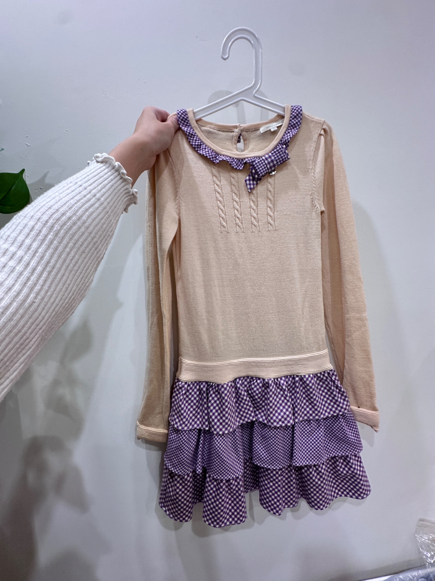 長袖羊毛針織紫格紋洋裝